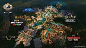 Las atracciones se distribuirán en cinco áreas temáticas: Celestial Park, El Mundo Mágico de Harry Potter — Ministerio de Magia, Super Nintendo World, Cómo Entrenar a Tu Dragón – Isla de Berk y Dark Universe.